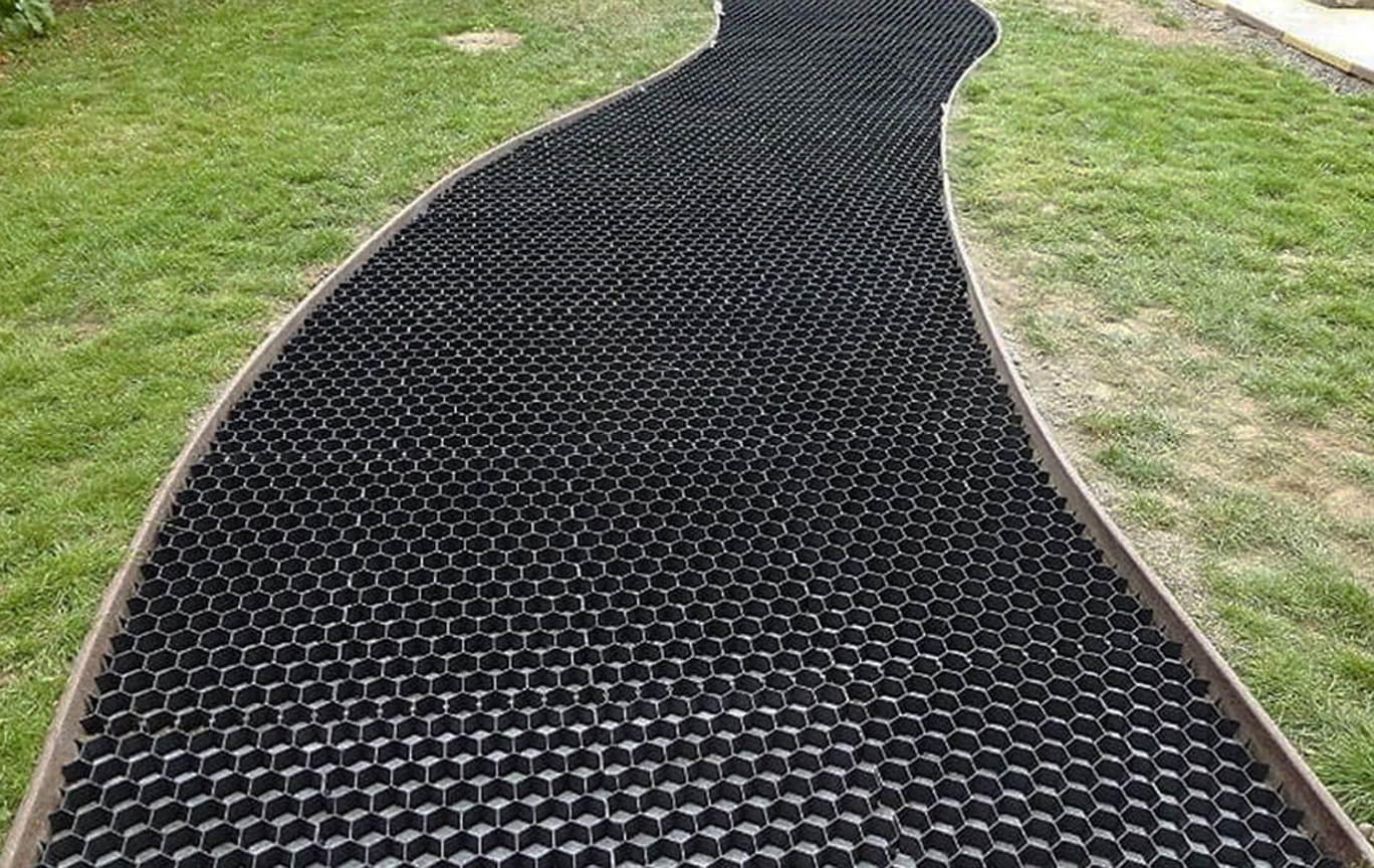 Основой такой конструкции служит полимерная газонная решетка, которая представляет собой модуль или рулон из ячеек. Она настолько прочная, что сможет выдержать нагрузку до 20 т. Выпускается в зеленом, черном и хаки цветов. Варианты можно подобрать здесь.