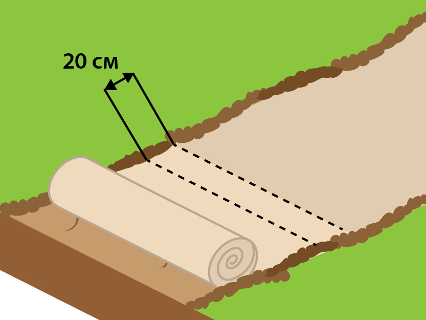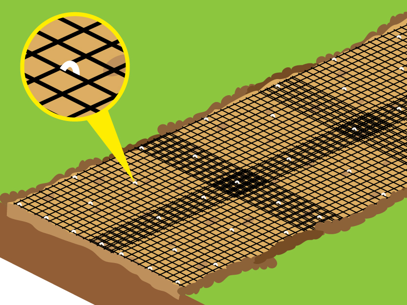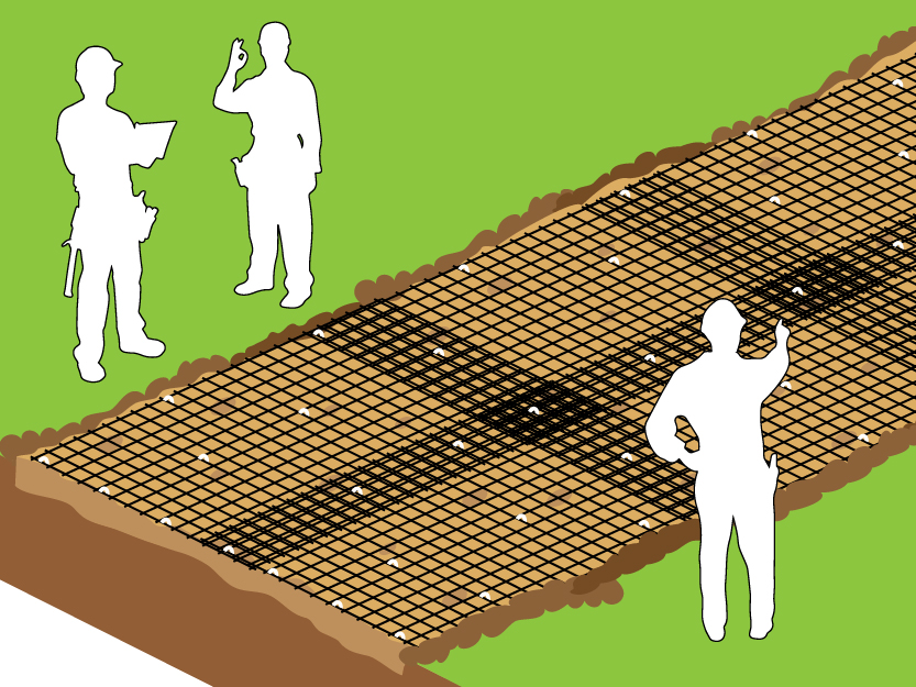 Для предотвращения сдвигов край сетки фиксируется анкерами через каждые 2 метра. Рулоны раскатываются рабочими вручную, при этом следует избегать появление волн и неровностей. Во время сильной ветровой нагрузки или для сохранения положения сетки полотно анкеруют через каждые 10-15 м с периодическим разравниванием и небольшим продольным натяжением. Внимание! Наезд и движение техники по сетке не допускаются. |