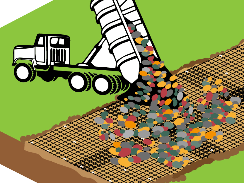 Отсыпка каменного материала Отсыпку материала (щебень, камни) ведут по методу «от себя» без заезда техники на открытое полотно. Размер фракции щебня зависит от размера ячейки геосетки: для ячейки 20х20 мм – фракция 20-40 мм, для ячейки 40х40 мм – фракция 40-70 мм. Толщина отсыпаемого слоя должна быть не менее 15 см, а при строительстве на слабом основании – не менее 20 см. Разравнивание производится бульдозером не менее чем за три прохода. При образовании на полотне волн в процессе распределения щебня необходимо вынуть монтажные анкеры, натянуть полотно и повторно установить анкеры. |