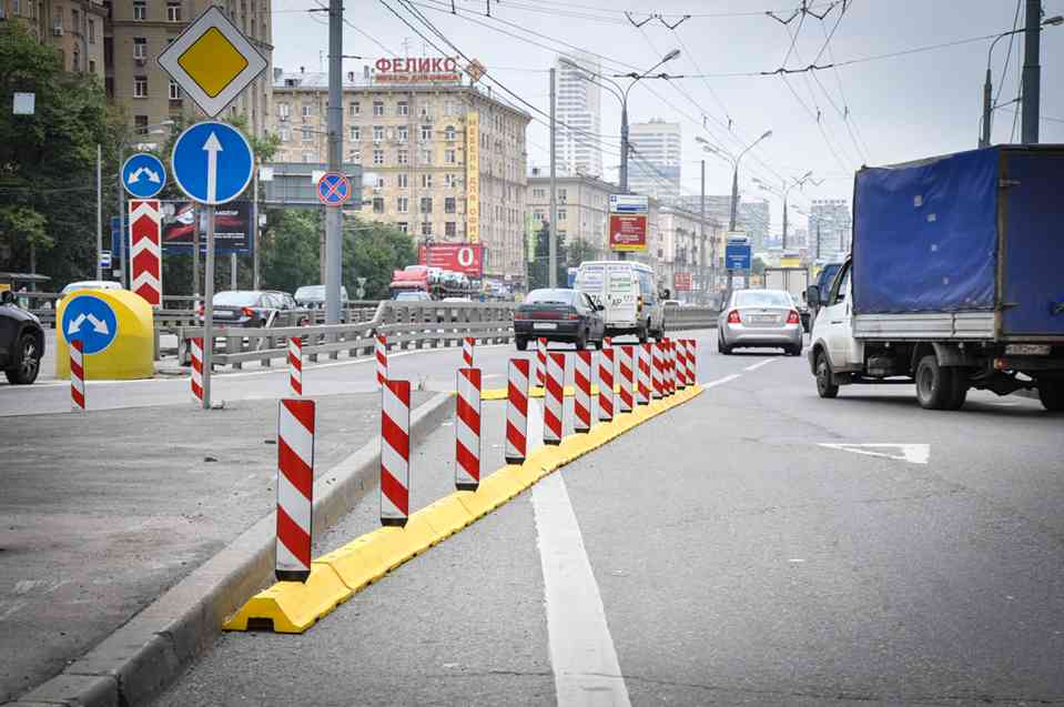 Направляющие пластины устанавливаются на утяжеленных опорах на проезжей части на всем протяжении зоны отгона. В качестве утяжеления применяются резиновые и полимерпесчаные подставки, делиниаторы.