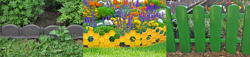 Такие садовые ограждения используют для оформления цветников, обрамления дорожек и кромки газона. Садовые бордюры состоят из частей с креплениями, которые соединяются друг с другом специальными замками. Внешне элементы комплекта представляют собой имитацию структуры дерева, кирпичной стены, штакетника, плетения из ивовых прутьев, пчелиные соты. Модульные пластиковые бордюры, кроме декоративной функции, защищают цветы от случайного скашивания, предотвращают вымывание почвы.