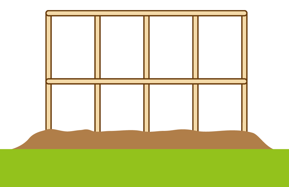 Вкопать или вбить опорные колышки в грунт на глубину 50-60 см. Расстояние между опорами 1 м.