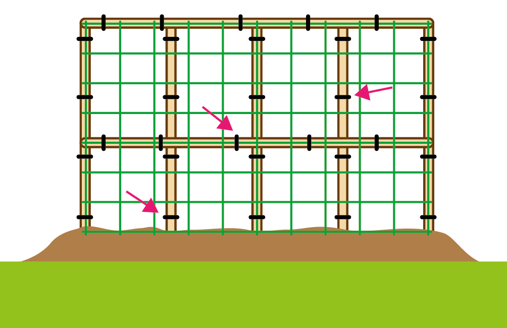 Установить поперечные перекладины для лучшего натяжения сетки и предотвращения ее провисания под весом будущего урожая.