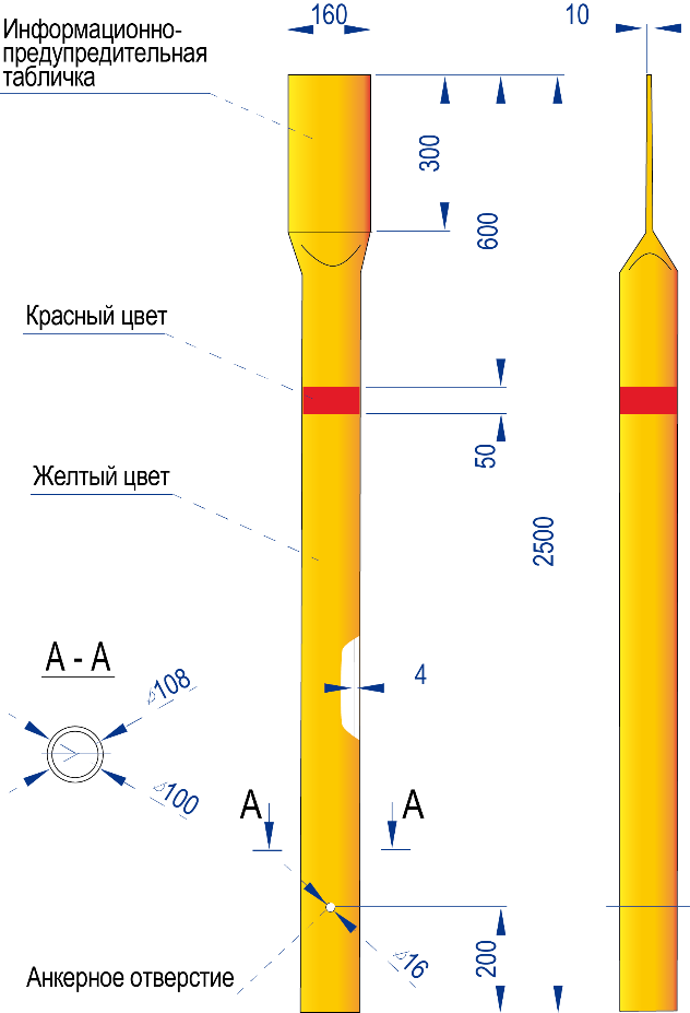 Столбик выпускается с горизонтальной полосой (разметкой) красного цвета шириной 50±2 мм. Плоская верхняя часть предназначена для размещения информационных табличек-указателей или специальной информации.