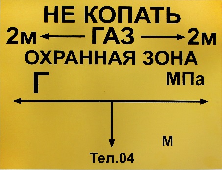 На опознавательный знак наносятся данные о диаметре, давлении, глубине заложения газопровода, материале труб, расстоянии до газопровода, сооружения или характерной точки и другие сведения.