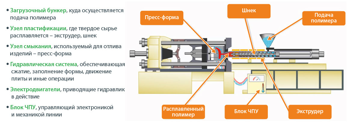 Шнек работает как поршень и выталкивает расплавленное сырье в пресс-форму для формирования изделия. |