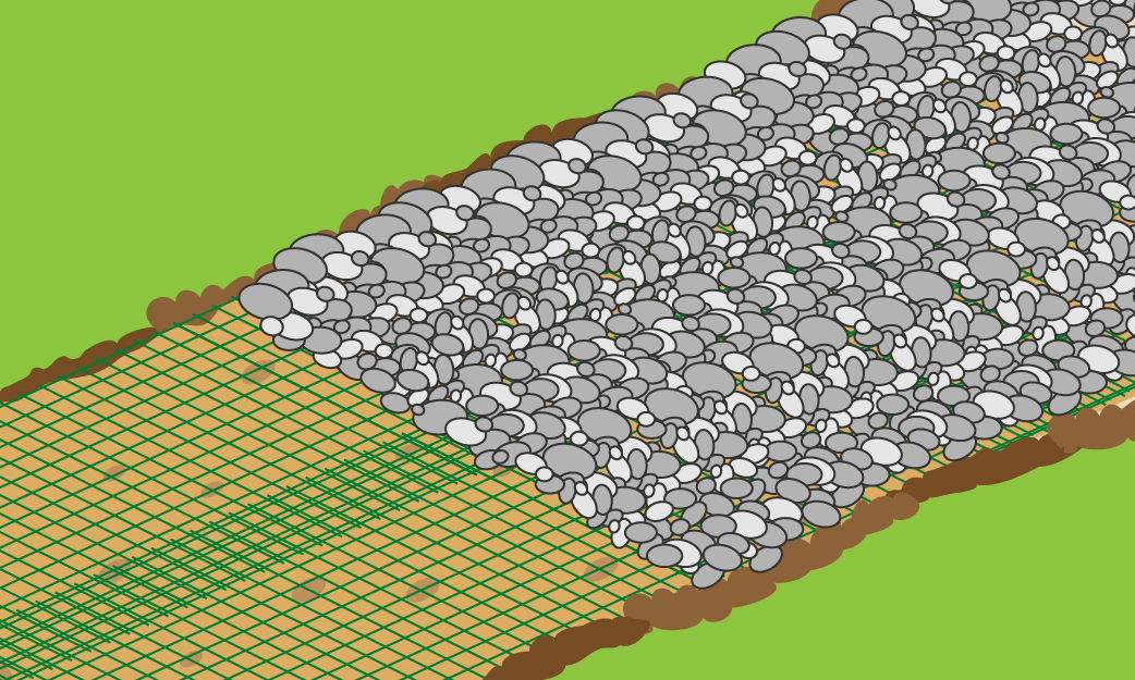 При строительстве дорожек, тротуаров, площадок проложенная между песком и гравием общестроительная сетка предотвращает смешивание слоев, тем самым позволяя уменьшить количество материала при строительстве.