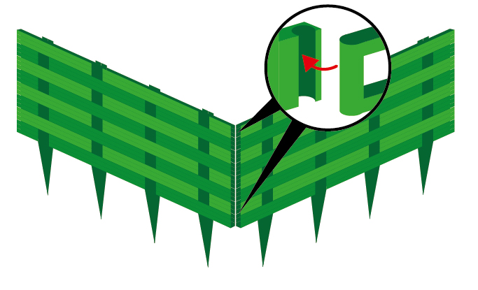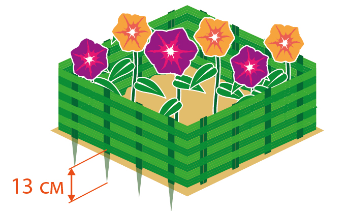 Установить ограждение, выстраивая по определенному контуру. Секции ограждения вставить в землю на глубину не более 13 см. При необходимости землю утрамбовать. |
