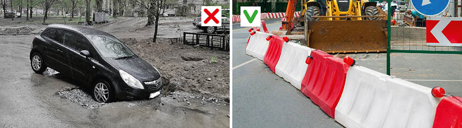 - в местах проведения дорожных работ с разрытиями – на расстоянии не менее 1 м от ее границы вдоль проезжей части; барьеры скрепляют между собой