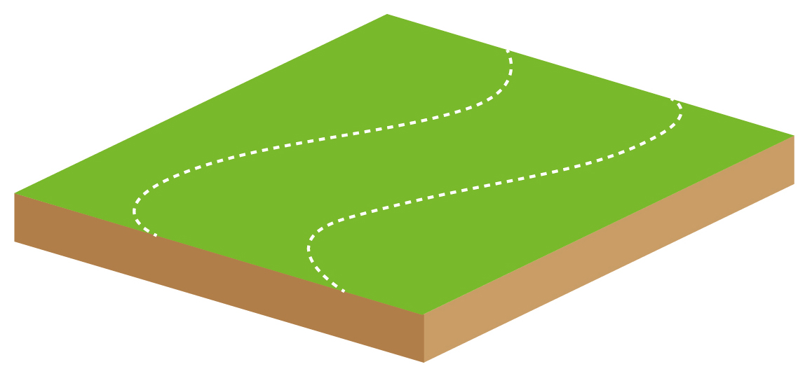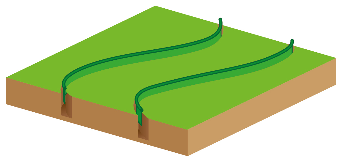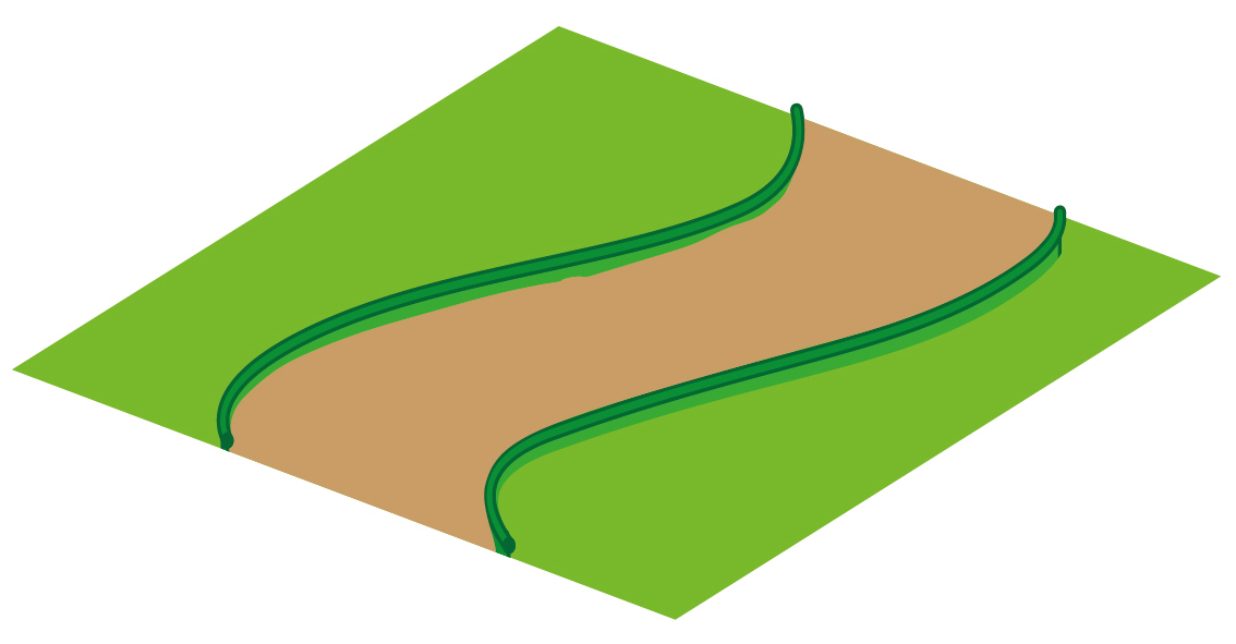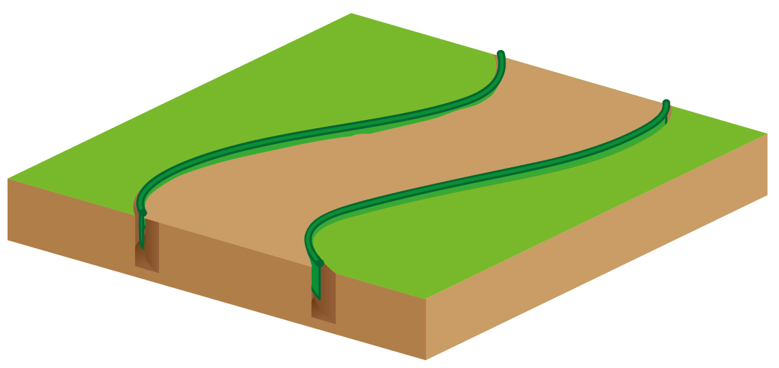 Трубка в верхней части ленты обеспечивает безопасность передвижения детей и животных по участку, придает эстетичный вид ландшафту. Крестообразная форма нижней части ленты фиксирует ее в земле с двух сторон, делает конструкцию устойчивой и минимизирует «всплывания» при сезонном движений грунтов.