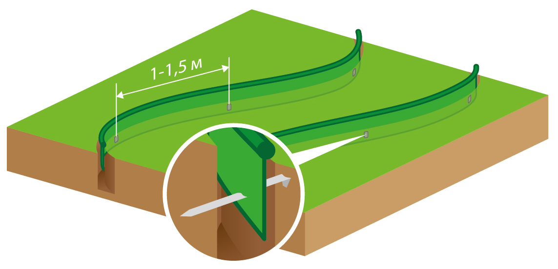 Для предотвращения сдвигов и выдавливания ленты из земли во время сезонных движений грунтов рекомендуется использовать металлические колышки или специальные якоря для фиксации бордюра. Для этого нужно пробить ленту в нижней ее части креплением под углом 45° через каждые 1 - 1,5 м. |
