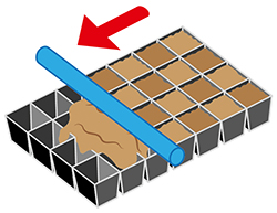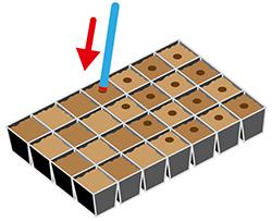 Заполнение кассет грунтомКассеты заполнить сухой почвосмесью и разровнять с помощью палочки, линейки. Полить и оставить на несколько часов, чтобы влага успела равномерно пропитать грунт.