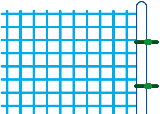 Закрепить сетку к опорам хомутами. Вместо хомутов можно использовать металлическую проволоку, строительный степлер или иные подручные средства. |
