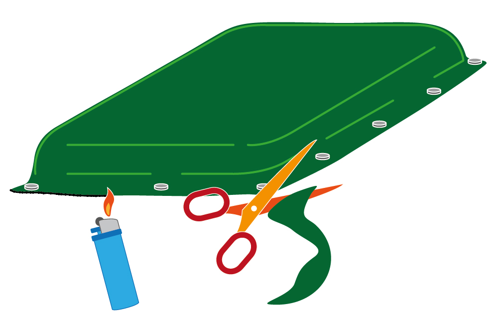 Для монтажа полотна понадобятся ножницы и крепления. При необходимости можно использовать строительный фен или горелку/зажигалку для обработки краев ткани.
