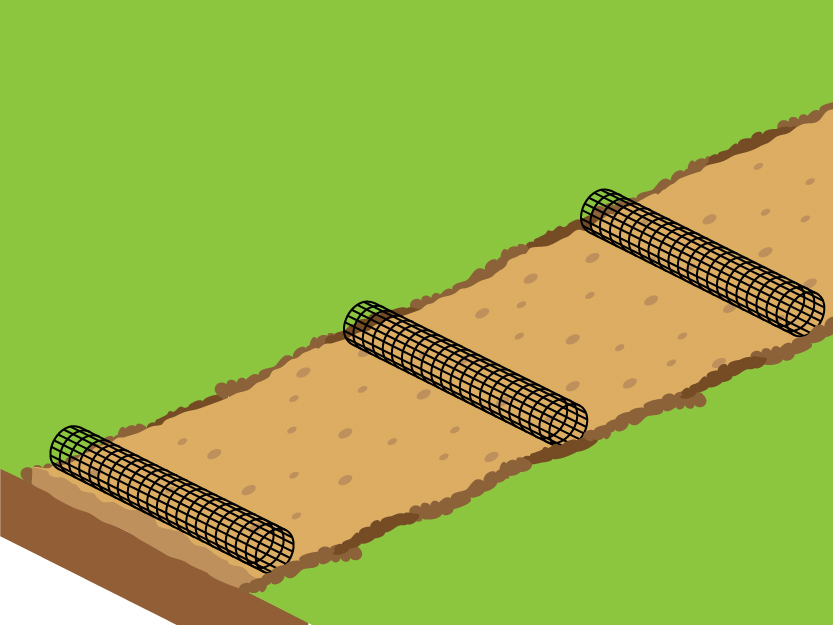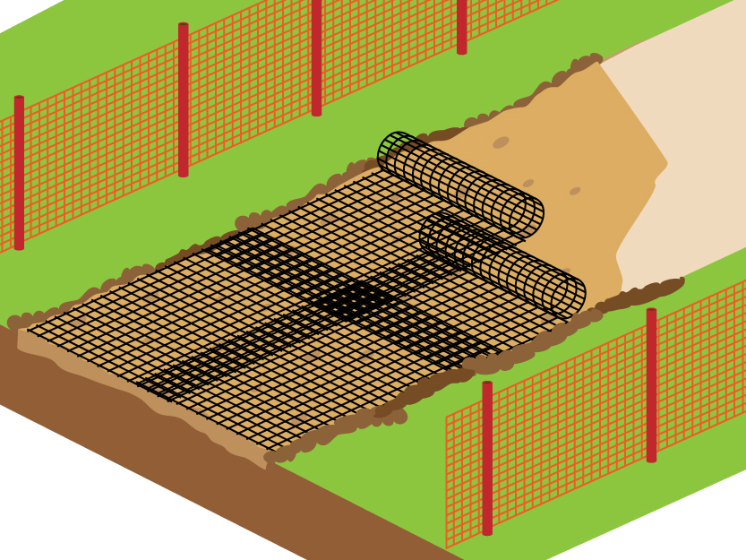 Во время сильной ветровой нагрузки или для сохранения положения сетки полотно анкеруют через каждые 10-15 м с периодическим разравниванием и небольшим продольным натяжением.