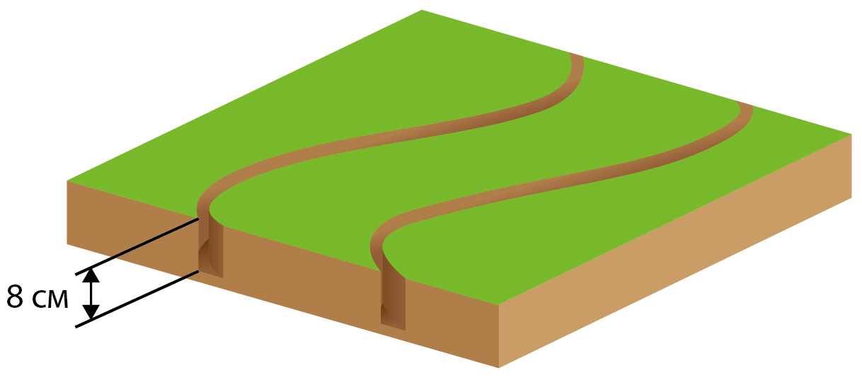 Выкопать канавку глубиной 8 см вдоль намеченной границы. |